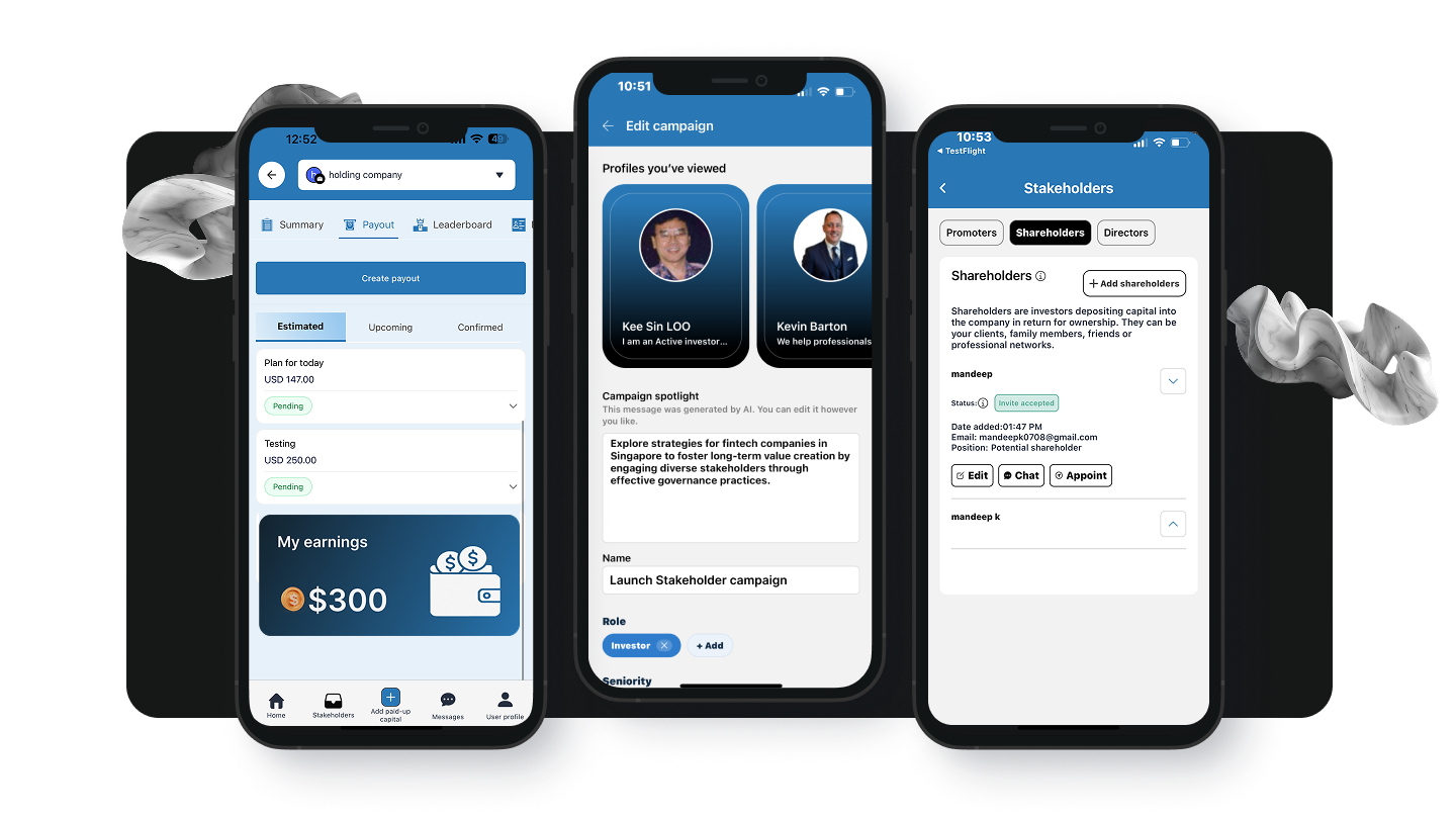 Launch stakeholder campaigns, earn from advisory practise, appoint others to ventures — all with kimbocorp tools.